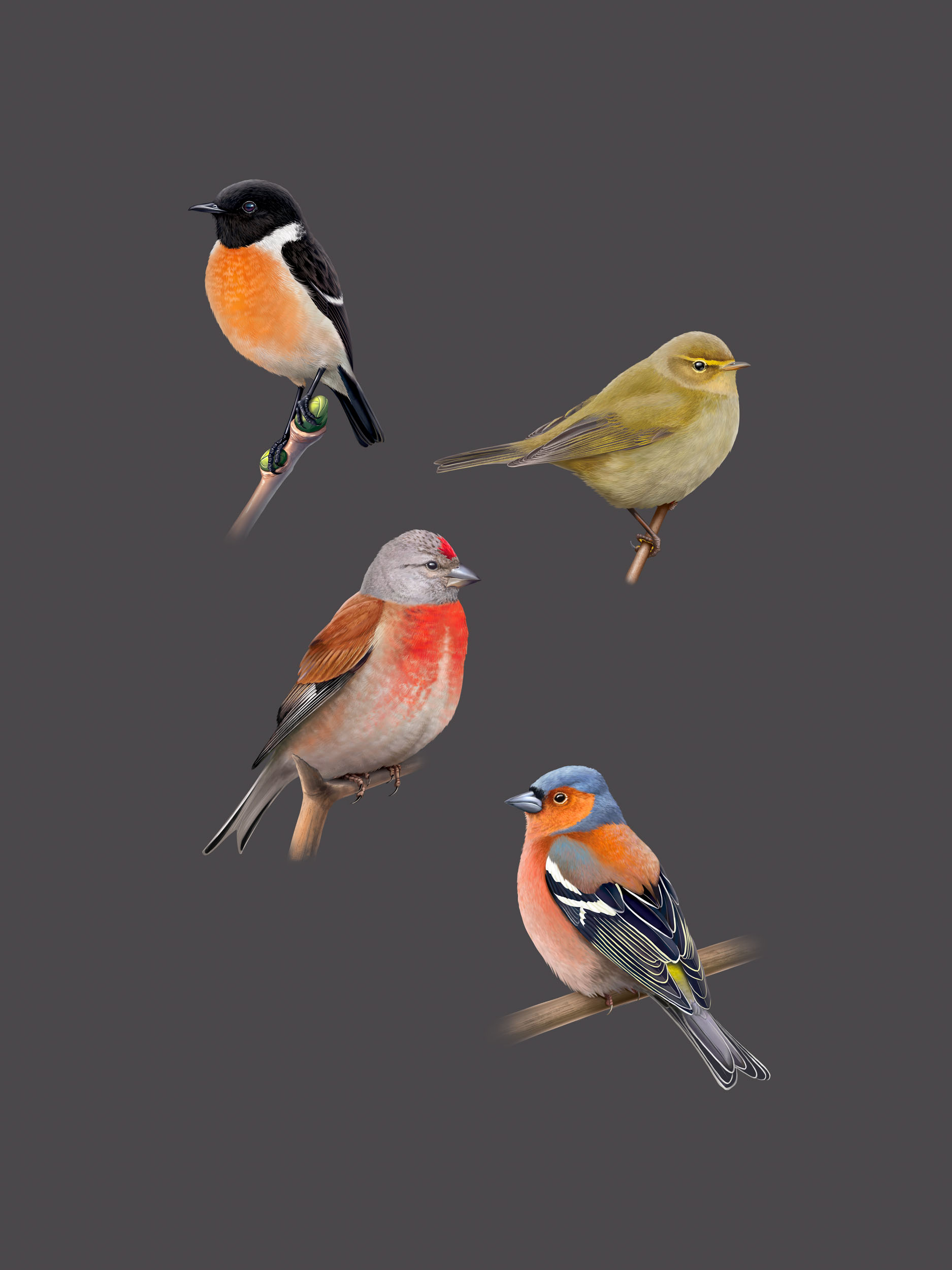 Tarier pâtre, Poulliot véloce, Linotte mélodieuse, Pinson des arbres